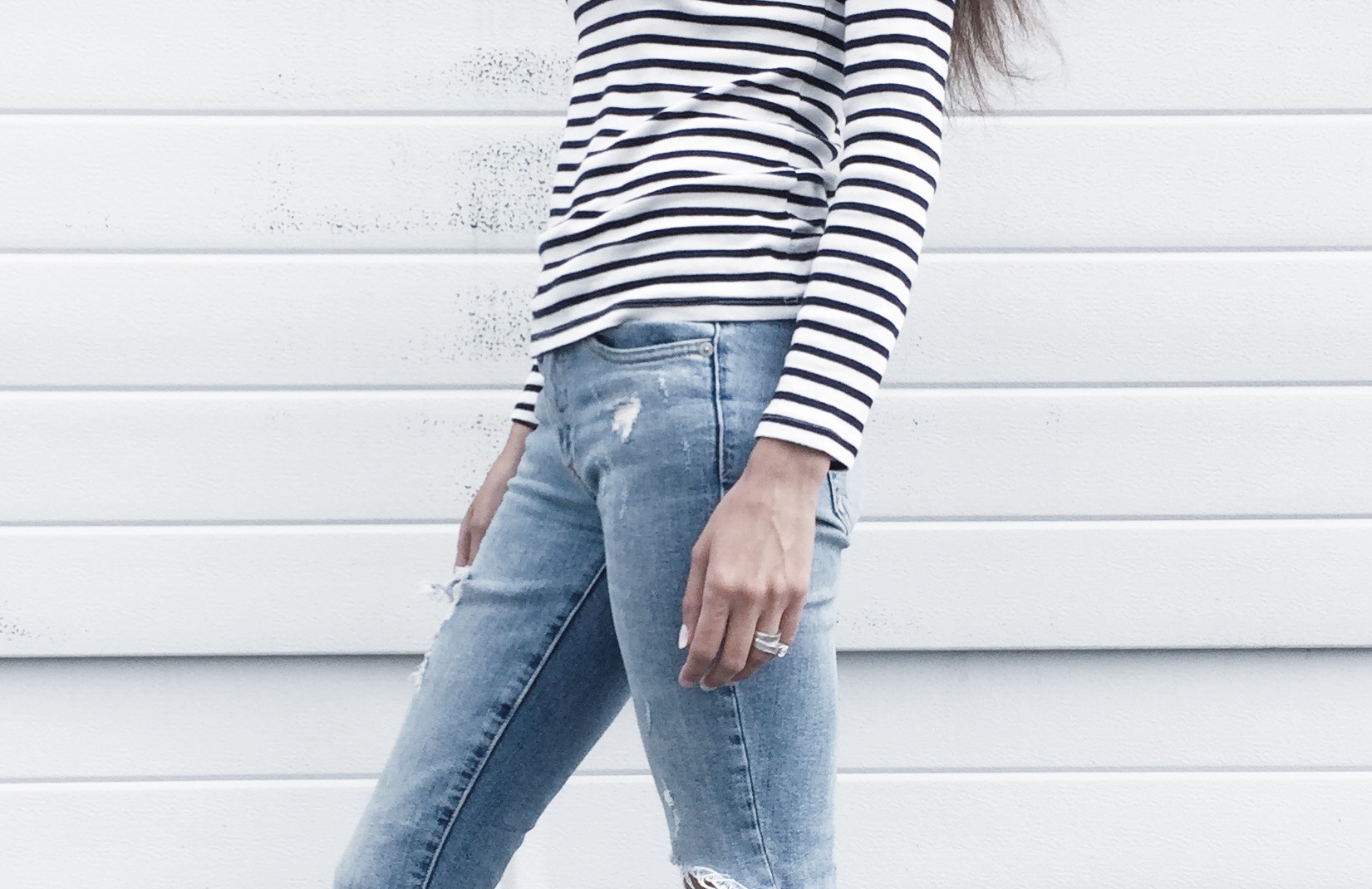 I’ve been wearing my mom jeans a lot lately. I wanted to switch it up today and opted for a pair of distressed jeans. These were my favorite jeans last year. I loved them so much that I bought a size up when I was pregnant with Emme. They’re a part of the Gap’s 1969 collection. I love the distressing (the more you wash them, the more distressed they become), the narrow leg and the light wash. They’re a mid-rise fit which is always great if you’re wanting a bit of coverage. I find them extremely comfortable to wear; they’re not stiff and yet they have some structure.